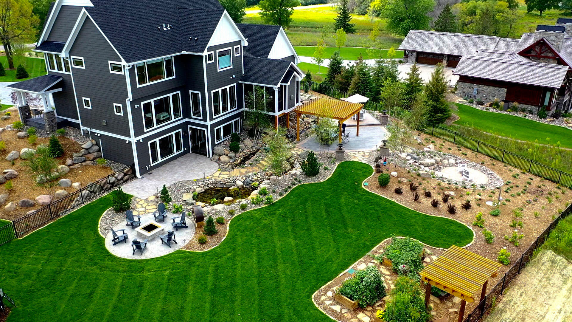 Porcelain patios are featured in multiple places on this property, paired perfectly with cedar accents throughout: custom cedar pergola, raised cedar beds, and cedar arbor. Note the natural stone, wood burning fire pit near the pond, with its subtle Lannon stone block and Indiana Limestone cap.